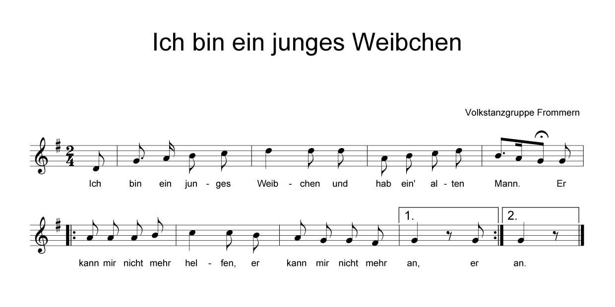 Musik Quelle: CD Lompa - Liedle Musikgruppe: Volkstanzgruppe Frommern Musikanten/Sänger: Katja Faßbender Aufnahmejahr: 1994 Aufnahme Ort: Balingen Aufgenommen durch: Gabel-Puschmann Arrangement: Manfred Stingel Musikaufnahmerechte: Volkstanzgruppe Frommern Musik Live-Aufnahme der Geschichte des Tanzes in Öhringen, 2006 Musikgruppe: Volkstanzgruppe Frommern Musikanten/Sänger: Hanna Brinkmann Aufnahmejahr: 2006 Aufnahme Ort: Öhringen Musikaufnahmerechte: VTGF Notenblatt Volkstanzgruppe Frommern | |||||||||||||||||