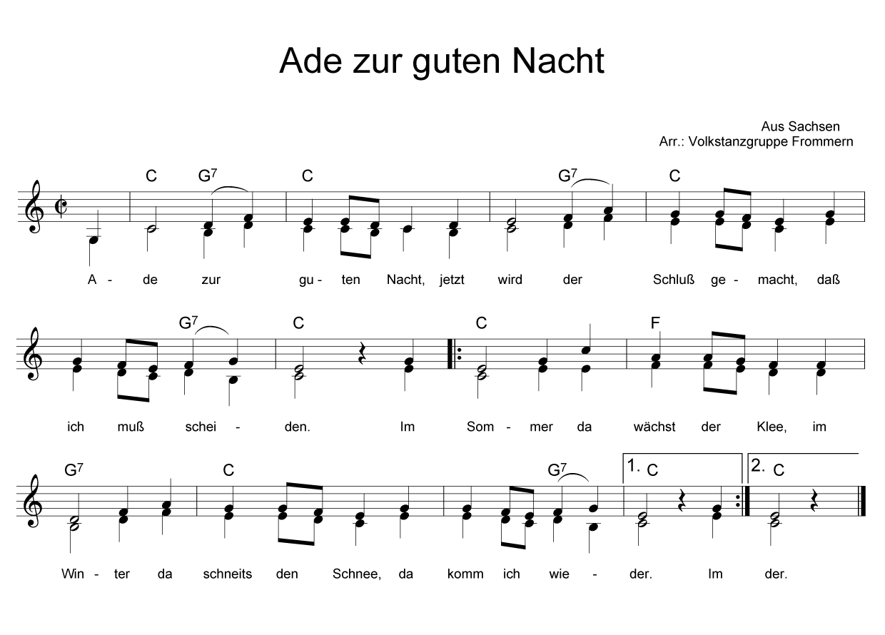 Notenblatt Quelle: Das kleine dicke Liederbuch Notenblatt Quelle: Liederbuch des Schwäbischen Albvereins Notenblatt Quelle: "Singen und Wandern" Klaviersätze Notenblatt Liederbuch "Stimmt an!" Notenblatt Volkstanzgruppe Frommern Notenblatt Quelle: Unsere Lieder - Volkslieder aus Hessen | |||||||||