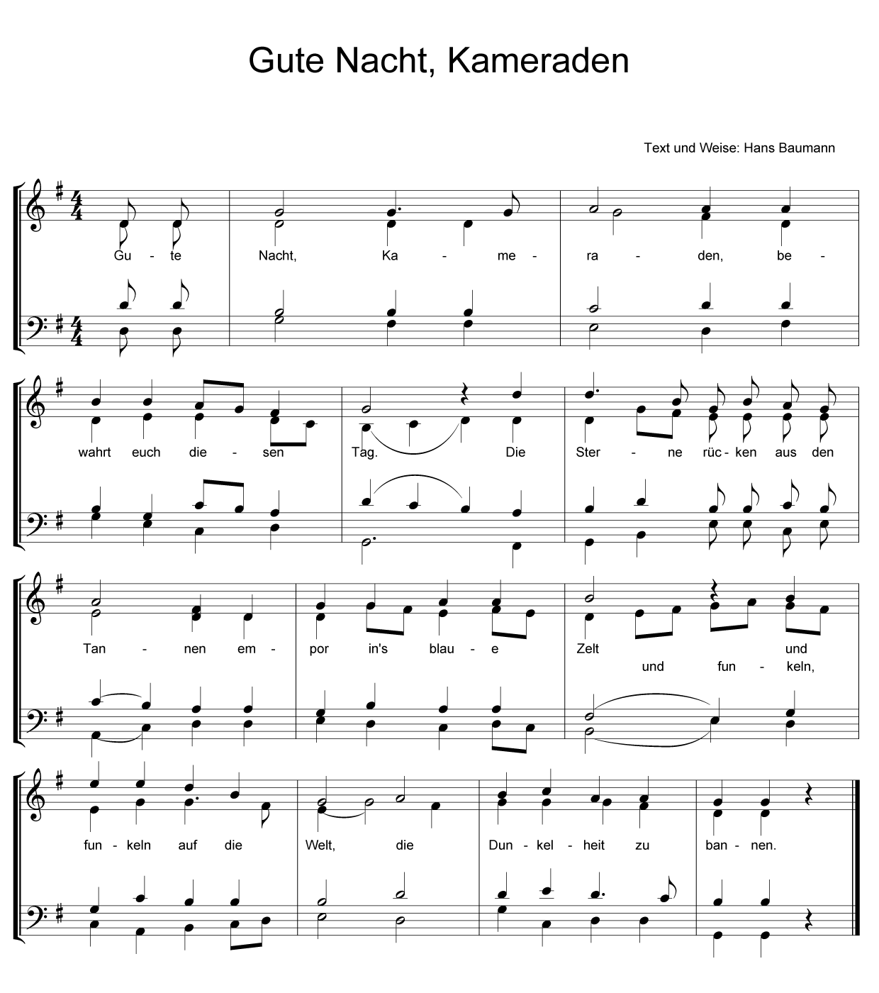 Guten Nacht, Kameraden, Bewahrt euch diesen Tag. Die Sterne rücken aus den Tannen Empor ins blaue Zelt Und funkeln auf die Welt, Die Dunkelheit zu bannen.