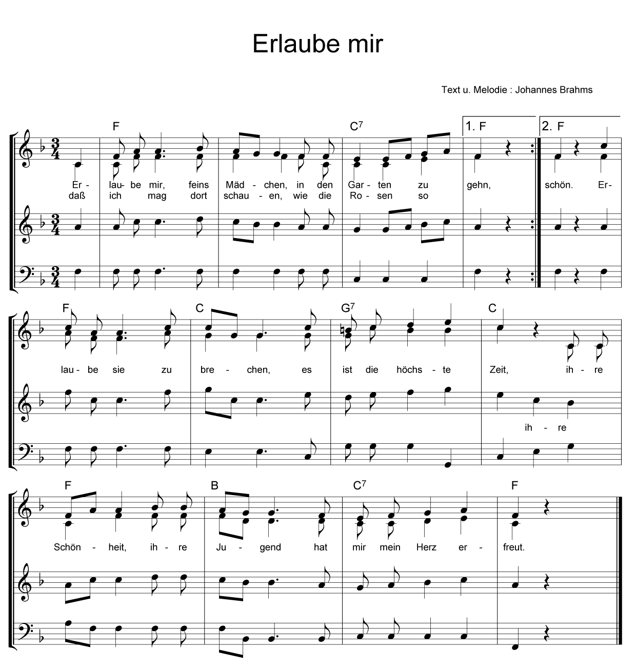 Erlaube mir, feins Mädchen, in den Garten zu gehn, dass ich mag dort schauen, wie die Rosen so schön. Erlaube sie zu brechen, es ist die höchste Zeit. Ihre Schönheit, ihre Jugend hat mir mein Herz erfreut.