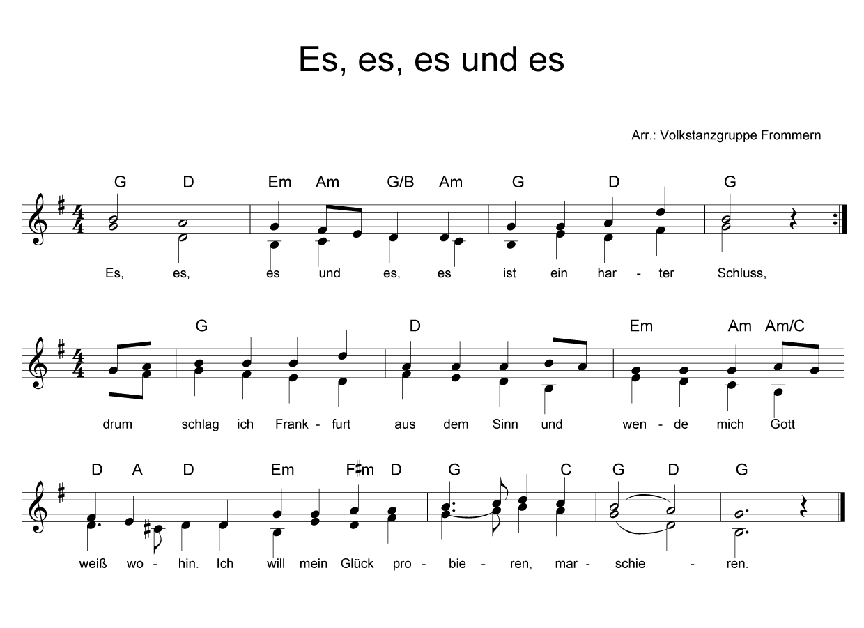 | 1 | Es, es, es und es, es ist ein harter Schluß, Weil, weil, weil und weil, weil ich aus Frankfurt muß. Drum schlag' ich Frankfurt aus dem Sinn Und wende mich Gott weiß wohin. Ich will mein Glück probieren, marschieren. |