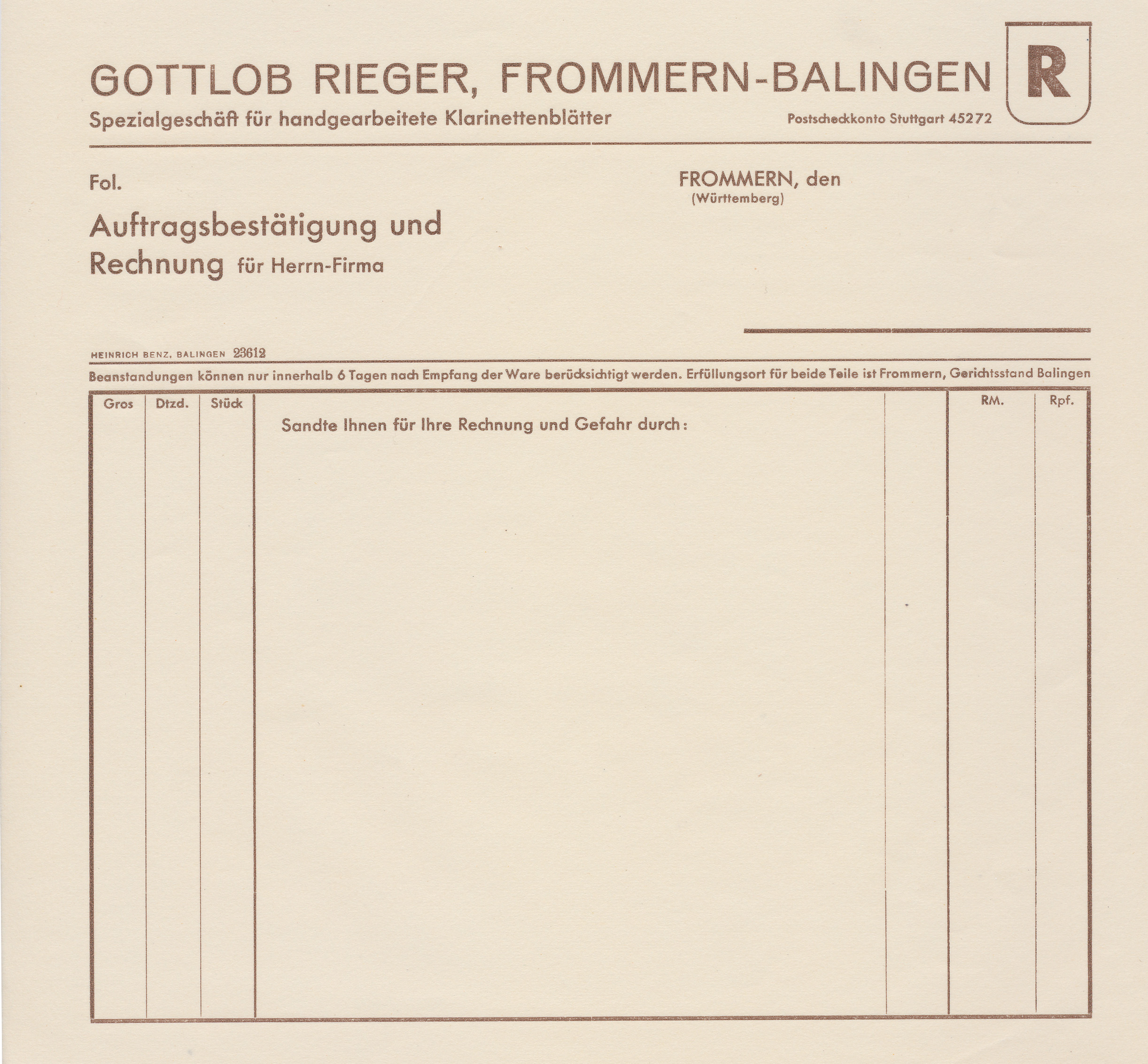 Abbildung Rechnungsformular Gottlob Rieger
